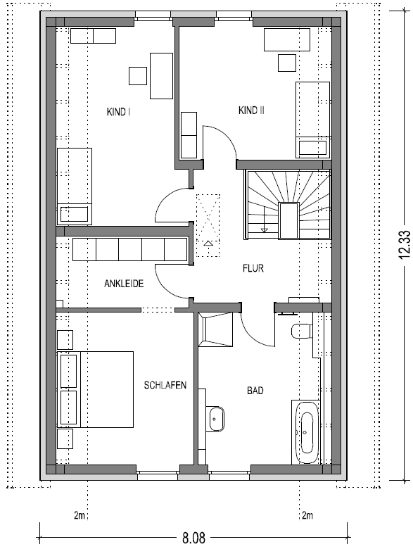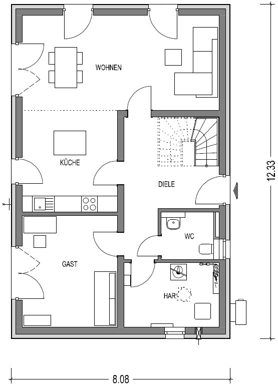 Wohnen, Küche, Kind I, Kind II, Schlafen, Gast, Ankleide, Bad, Gäste-WC, HAR, Diele, Flur